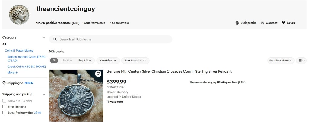 Theancientcoinguy has an excellent collection of coins that are affordable. He generally does not have gold coins as his shop is more about coins beginners can buy without stretching their budgets. The coins that I purchased were Byzantine Trachy Coins from the 12th to 13th Century.